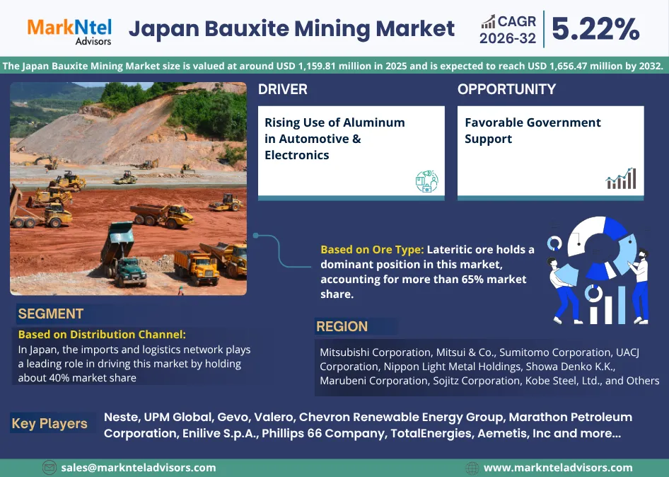 MarkNtel Advisors, a leading market research and consulting firm, has announced the release of its latest study titled Japan Bauxite Mining Market Research Report: Forecast (2026–2032). This report provides a detailed assessment of the Japan Bauxite Mining Market, covering its evolving dynamics, emerging trends, key growth drivers, major challenges, and competitive landscape.