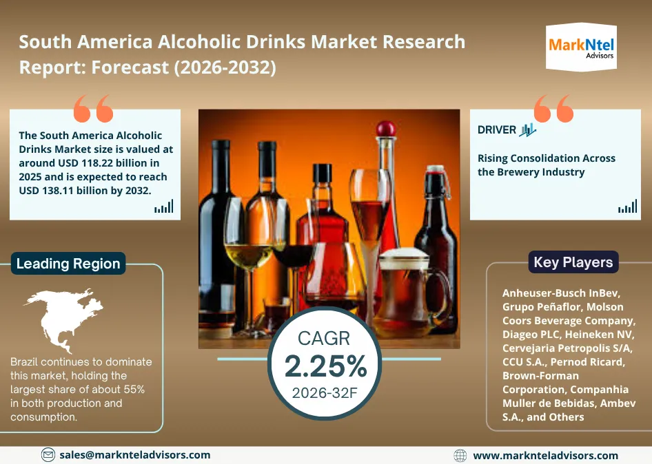 MarkNtel Advisors, a leading market research and consulting firm, has announced the release of its latest study titled South America Alcoholic Drinks Market Research Report: Forecast (2026–2032). This report provides a detailed assessment of the South America Alcoholic Drinks Market, covering its evolving dynamics, emerging trends, key growth drivers, major challenges, and competitive landscape.