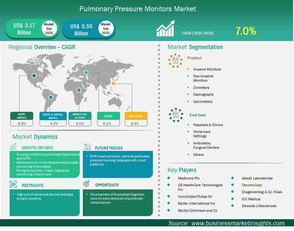 The pulmonary pressure monitors market size is expected to reach US$ 5,551.39 million by 2033 from US$ 3,168.82 million in 2024, highlighting a strong growth trajectory. The market is estimated to record a compound annual growth rate (CAGR) of 7.0% from 2025 to 2033, driven by increasing disease prevalence, technological advancements in monitoring devices, and growing adoption of remote patient monitoring solutions.